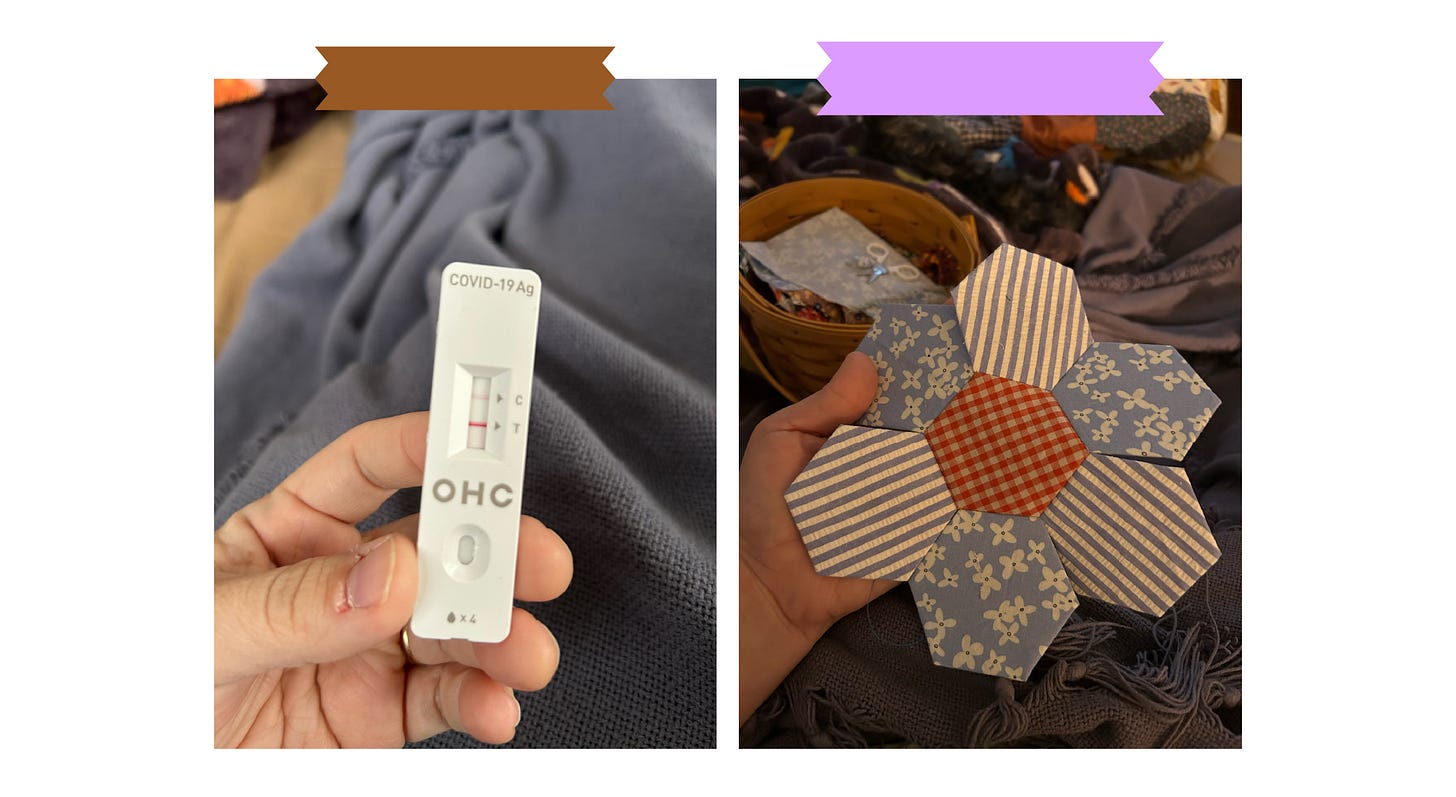 Not too long after the funeral, I found out I picked up COVID for the first time. I had avoided it for 5 years. This was happening while the Tik Tok stuff was happening. You know when it went down and then magically suspiciously came back the next day? While I was holed up in my room, bed bound, I worked on whatever handicrafts I could access without infecting the whole house. Luckily, I had some bedside hexies and some fabric scraps that I could work on.